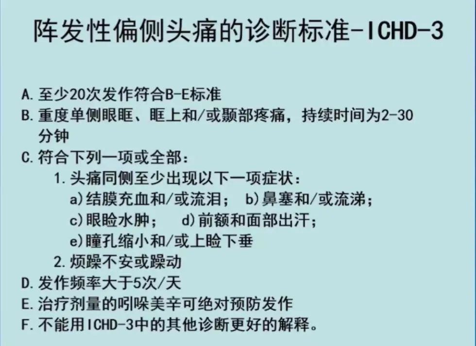 在介绍完发作性头痛的鉴别要点后,于挺敏教授又分别向我们讲解了几种常见原发性发作性头痛的临床特点及诊断标准,包括偏头痛、紧张型头痛、丛集性头痛、阵发性偏侧头痛等。