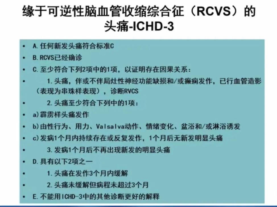此外,于挺敏教授还介绍了几种继发性发作性头痛,包括源于透析的头痛、心脏源性头痛、可逆性脑血管收缩综合征(RCVS)引起的头痛等(其诊断标准见图6、7、8)。