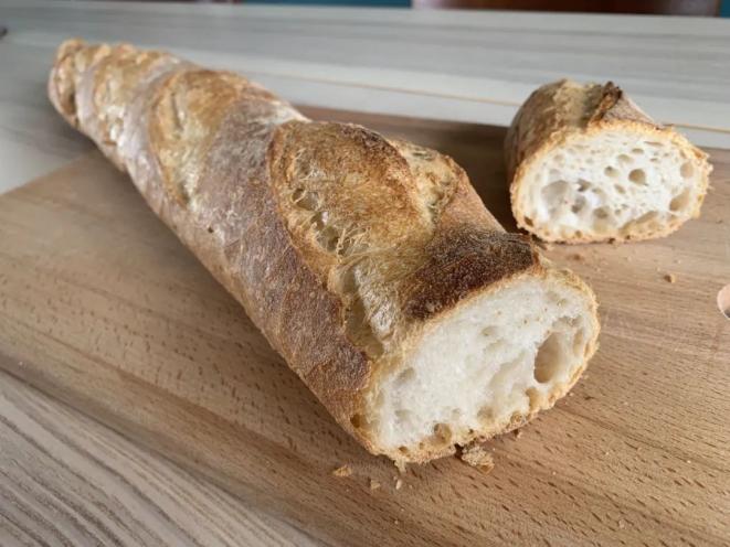 其次是炉子。烤法棍用的是蒸汽烤箱,使用时需要注入水蒸气,这样面团在烤熟前能够充分吸水膨胀,表皮均匀不会干裂,制作出的法棍整体轻盈带有空气感。停止加入水蒸气后,干热的烤箱就会把面包的表皮烘干成脆脆的质地。刚出炉的法棍表皮酥脆可口,随着时间流逝,才会逐渐风化逐渐变硬。