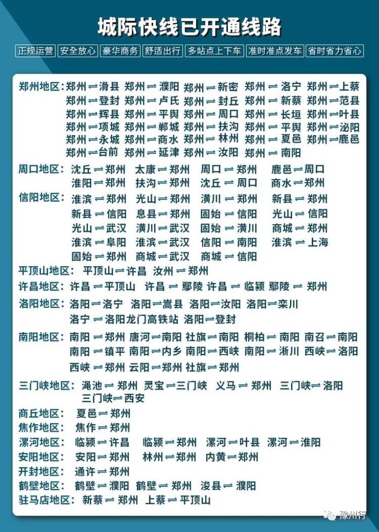 郑州高铁枢纽站郸城、登封、光山、巩义、鹿邑、新密郑州中心站安阳、亳州、郸城、登封、固始、巩义、鹤壁、靖江、临汾、内黄、平舆、太原、项城、新蔡、西华、新密、浚县郑州汽车客运北站薄壁、泛区、固始、巩义、鹤壁、洛阳、温县、新密、浚县郑州汽车南站宝丰、泌阳、登封、固始、巩义、平顶山、汝阳、新密、息县、信阳、鸭河电厂、宜路镇、驻马店空港巴士站(郑州机场)郑州四环内快线、安阳专车、登封专车、郑州火车站快线、航空港高铁站快线、济源专车、焦作专车、开封专车、洛阳专车、南阳专车、濮阳专车、许昌专车、新密专车、新乡专车、新郑快线、原阳专车、禹州专车、驻马店专车登封汽车总站焦作、开封、漯河、兰考、洛阳、南阳、濮阳、杞县、新密、新乡、周口、驻马店、郑州北站、郑州东站、郑州南站新密长途汽车站(西)郸城、登封、鹿邑、新蔡、许昌、新乡、信阳、周口、郑州、郑州东站、郑州南站巩义客运总站漯河、新乡、郑南站高、郑州南站安阳中心站
