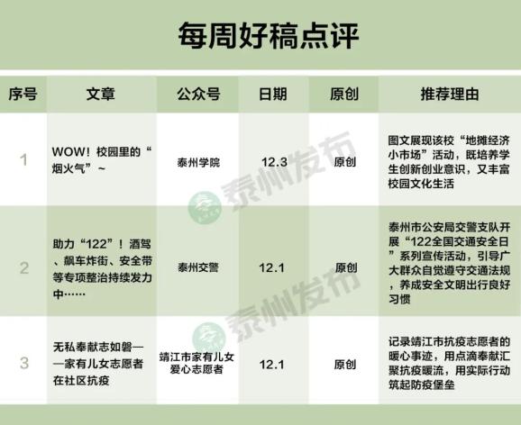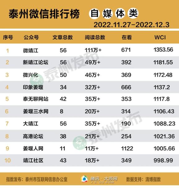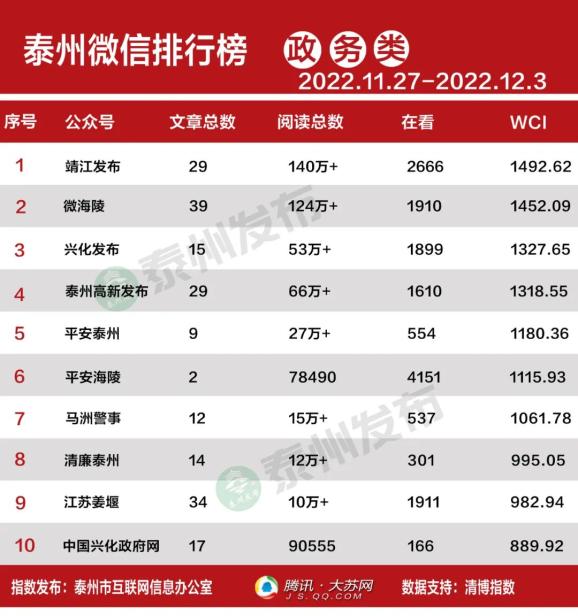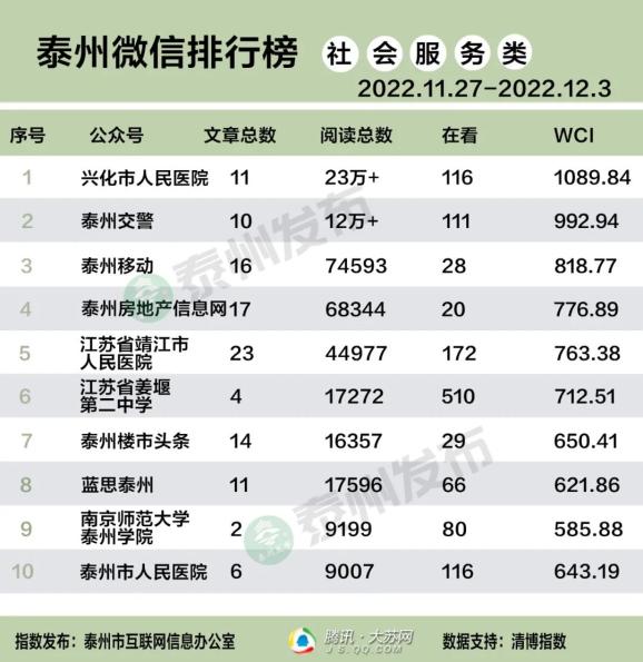 “泰州市微信排行榜”由泰州市互联网信息办公室和腾讯大苏网联合发布,榜单发布采用清博指数。本次公布2022年11月27日至2022年12月3日周榜。
