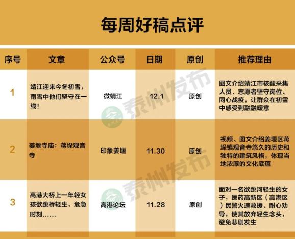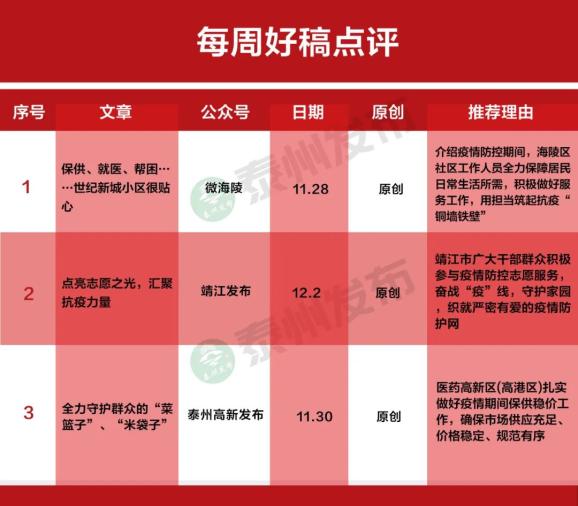 围绕疫情防控,11月28日,“今靖江”推文《疫情下的靖江,流淌着一种力量…》,细数靖江市同心战疫的暖心故事,用众志成城的实际行动,汇聚起抗击疫情的强大合力;12月1日推文《日夜坚守,点亮希望!》,多图展示靖江市机关在职人员、社区工作者、志愿者坚守抗疫第一线身影,不畏严寒,守土尽责,用行动传递真情,用奉献书写大爱。12月1日,“微泰州”推文《上午9时许,泰州这里发生的一幕》,报道医药高新区(高港区)明珠派出所民警为处于疫情防控区内的市民紧急购买所需药品,体现为民本色。