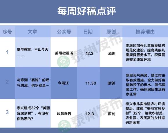 聚焦民生实事,12月2日,“泰兴发布”推文《60项政务事项实现“秒办”,具体是……》,报道泰兴市从群众实际需求出发,在全市政务服务领域推行“智能秒办”改革,60项政务事项实现“秒批秒办”,按下提升政务服务效能的“加速键”。同日,“江苏姜堰”推文《提升“价”服务,为城市发展加速度》,报道姜堰区不断强化价格服务意识,提升价格服务质量,有效维护市场正常秩序,真正把“为民办实事”工作落到实处。