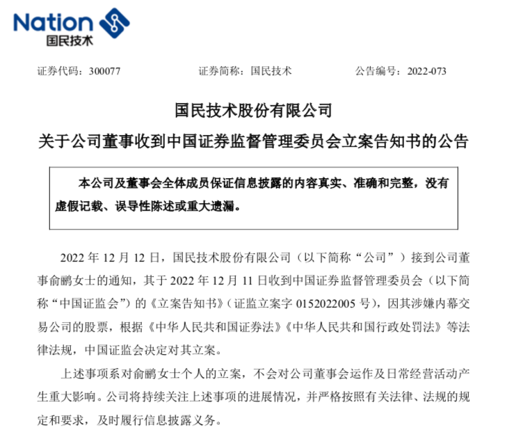 因一名59岁董事涉嫌内幕交易被中国证监会立案调查,两家上市公司先后发布《立案告知书》。12月12日晚间,国民技术股份有限公司(简称“国民技术”,300077)发布公告称,接到公司董事俞鹂的通知,其于12月11日收到中国证监会的《立案告知书》(证监立案字0152022005号),因其涉嫌内幕交易公司的股票,中国证监会决定对其立案。