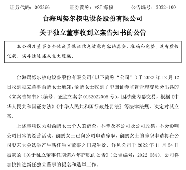 当日晚间,台海玛努尔核电设备股份有限公司(简称“*ST海核”,002366)也发布公告,称独立董事俞鹂收到证监会立案告知书,因涉嫌内幕交易,中国证监会决定对其立案。