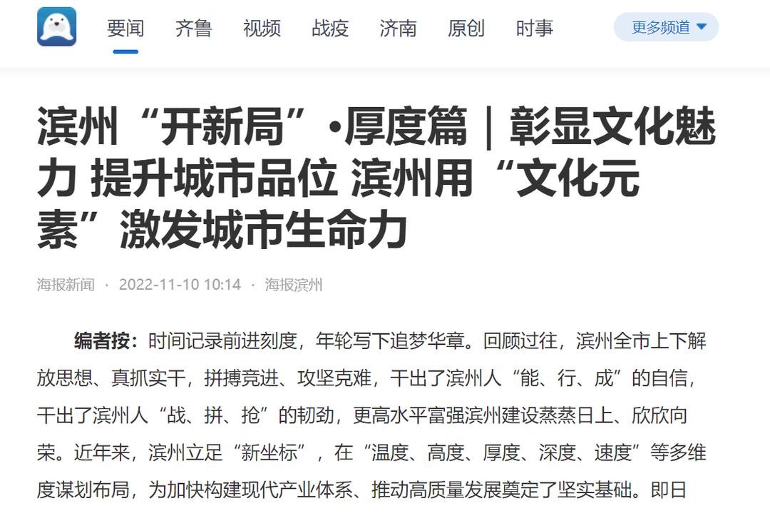 3传播力排名第三的是宣传报道《滨州“开新局”·厚度篇|彰显文化魅力 提升城市品位 滨州用“文化元素”激发城市生命力》,由大众网·海报新闻报送,在大众网、海报新闻等网络平台推送,阅读量达314万,传播力指数为9.8。