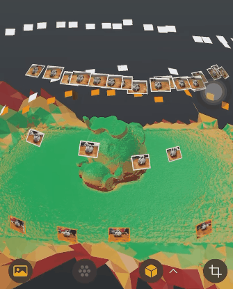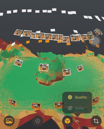 当各种角度的照片拍摄的累计出一定数量之后,屏幕上就会出现一个混杂着绿色、黄色以及红色点状分布的模型。