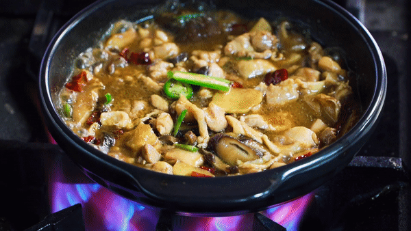 滋啦作响的砂锅中盛着肉质紧实的鸡肉,大块香菇与青椒点缀其中。不用尝肉,香气就早已窜进鼻腔。