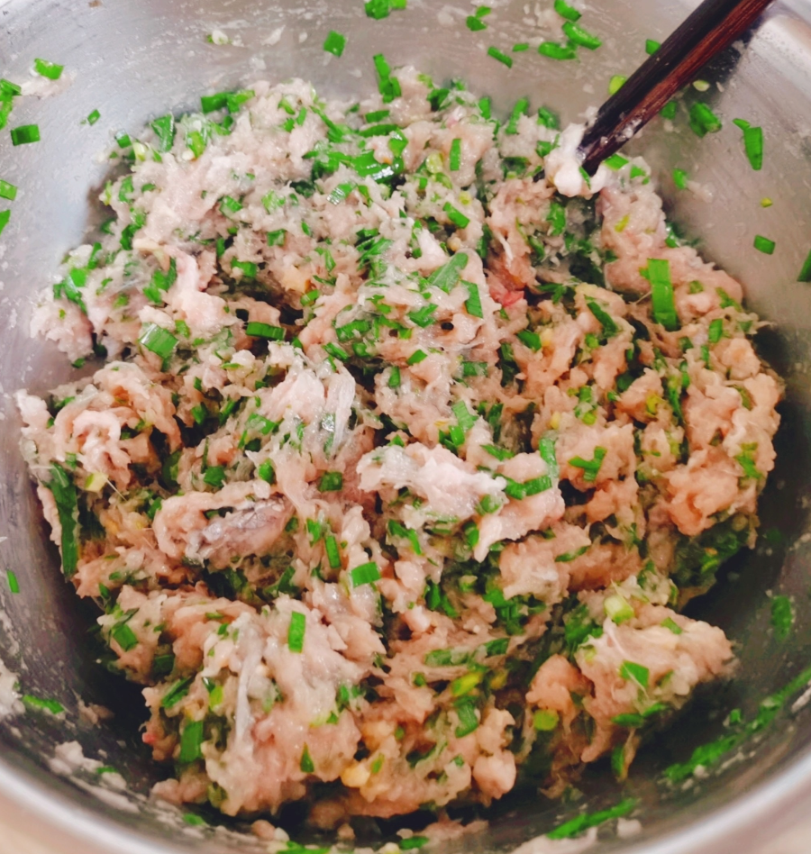 鲅鱼剔骨去皮,切成肉糜,加入葱姜水与调味料搅至泛起鱼油,再放上蛋清、五花肉、韭菜末。