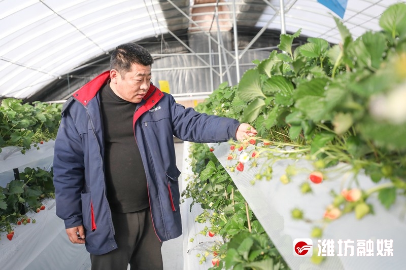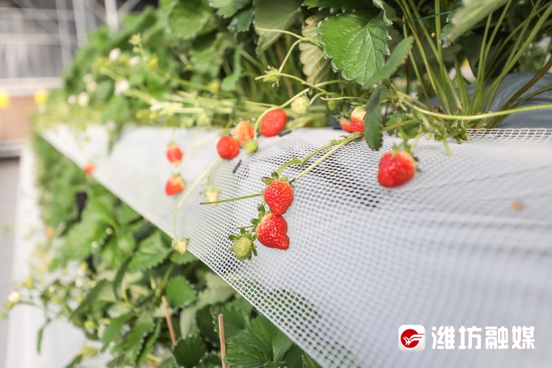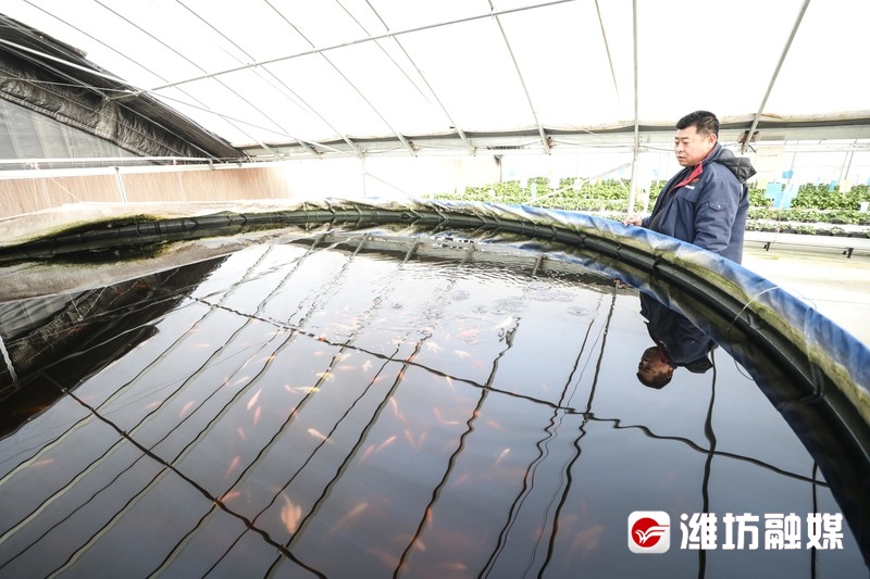 潍坊日报社潍坊融媒讯 12月12日,走进寿光市洛城街道后尹村种植户李学良的温室大棚,一枚枚或红或绿的草莓探出藤蔓,阵阵果香扑面而来。与土培草莓不同的是,这些草莓脱离地面,种在空中,实现水肥一体化无土栽培模式;在大棚的另一边,鱼儿在鱼池里戏水,一派蔬果丰茂生机勃勃的景象。这就是李学良的新型复合耕作体系——鱼果共生。鱼果如何共生?“秘诀就在于全天不停的水循环系统。”42岁的李学良笑着告诉记者。