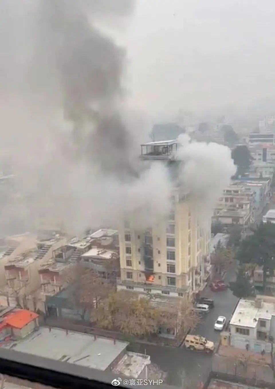 枪战的声音大概持续了一个多小时,前半个小时比较密集,后面是偶尔响几声。这个时候就看到阿富汗临时政府的警察和特战队出现在酒店附近,我们还通过窗户跟他们打招呼,但是沟通不了。