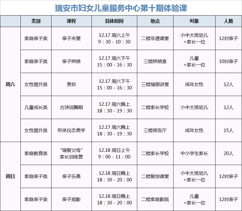 原标题:《【活动报名】童“享”美好课堂,如期而至!瑞安市妇女儿童服务中心第十期(12月17日-18日)体验课速递来啦!》