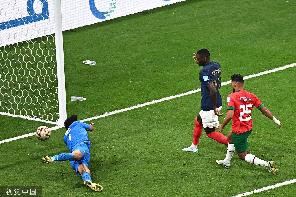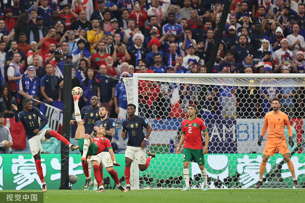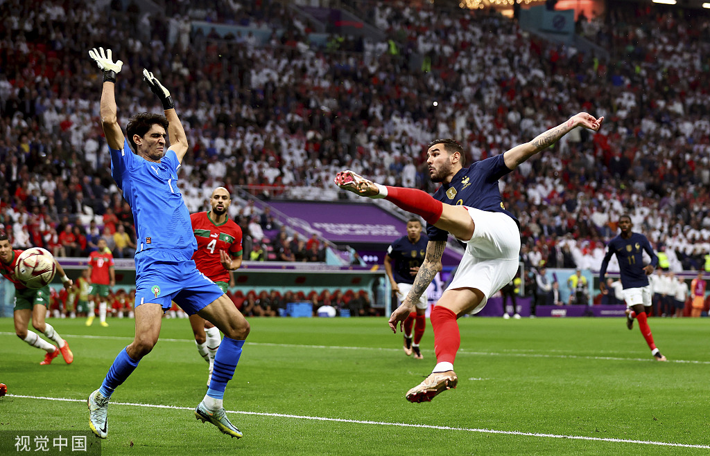 上半场刚刚开场4分39秒,法国队就制造了威胁——格里兹曼灵巧转身摆脱,姆巴佩在中路制造混乱,特奥凌空射门为法国取得领先,送给摩洛哥本届世界杯除乌龙球外的首粒失球。