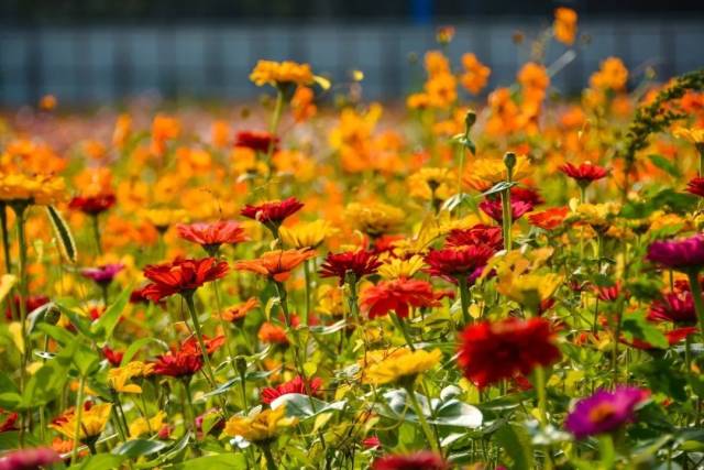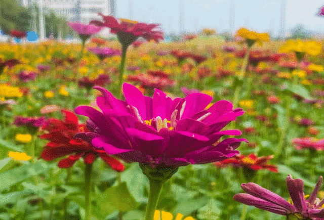 紫色靓丽、粉色秀美、黄色明艳……各色的百日菊在蓝天下恣意生长组成一幅多彩的风景画,增添生机与活力!