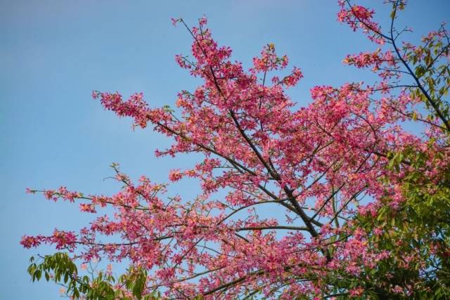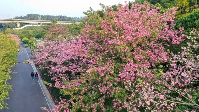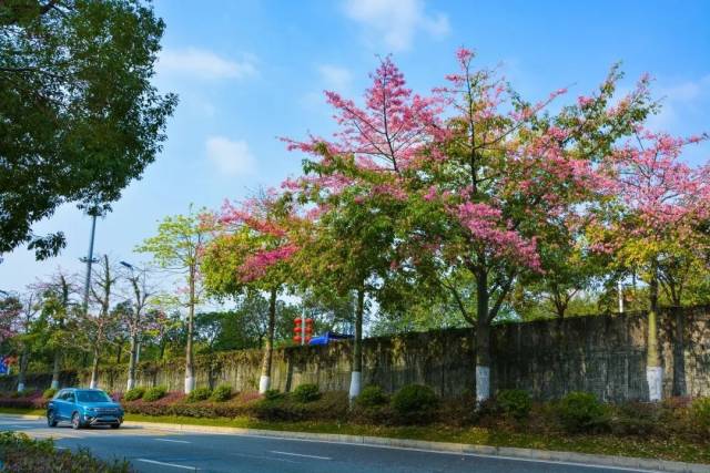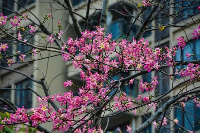 星星点点的粉色挂满枝头与常绿的乔木相互交错,成为城市的别样风景。