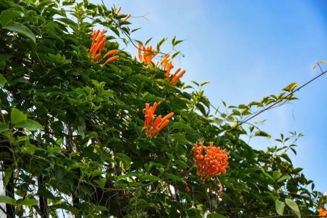 缀满枝头的炮仗般的橙黄花朵开得喜庆,开得热闹,与成片绿叶相映衬成一道靓丽的风景线。