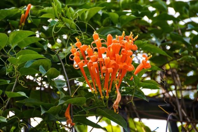 花橙色的炮仗花在阳光的照射下,显得格外光彩夺目。