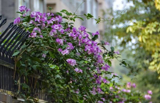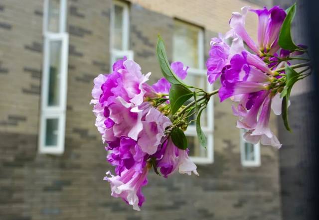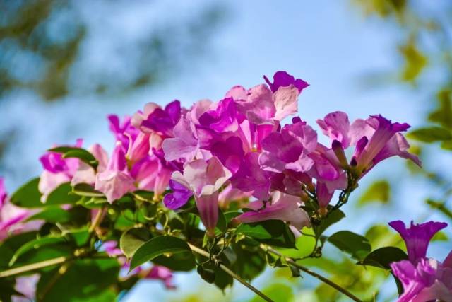 蒜香藤也叫“紫铃藤”,柔嫩的花朵肆意盛开,仿佛垂挂着团团的粉彩绣球。