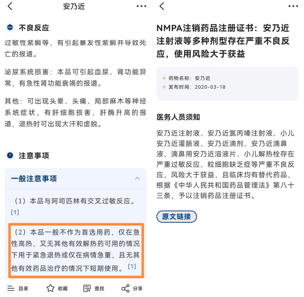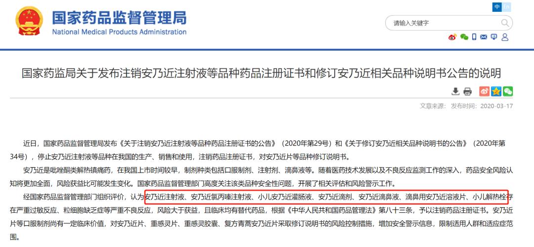 图源「临床决策助手App」,欢迎下载,来循证用药、安全警示功能搜索,查看用药详情此外,早在2020年3月,药监局就已经两次发布公告,注销了包括安乃近注射液、安乃近氯丙嗪注射液、小儿安乃近灌肠液、安乃近滴剂、安乃近滴鼻液、滴鼻用安乃近溶液片、小儿解热栓在内的7种安乃近类型。