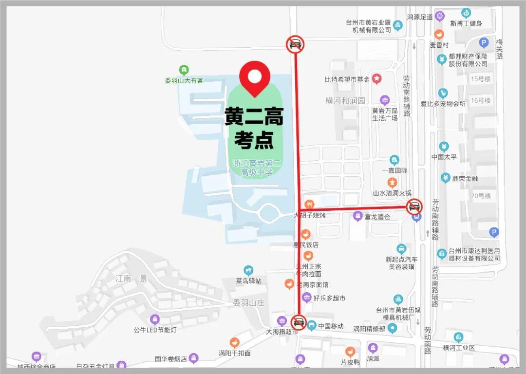 3.台州市黄岩第二高级中学考点:横羽路、朱红街及朱红街与劳动南路交叉口实行交通管制和禁鸣喇叭。