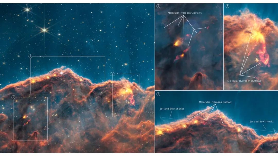 数十个以前隐藏的喷气机和年轻恒星的流出在美国宇航局詹姆斯韦伯太空望远镜的近红外相机(NIRCam)的宇宙悬崖新图像中揭示。宇宙悬崖是NGC 3324内一个巨大的气态腔边缘的一个区域,长期以来一直吸引着天文学家,因为它是恒星形成的温床。NGC 3324中恒星形成的许多细节仍然隐藏在可见光波长下。韦伯完全准备好梳理出这些长期追捧的细节,因为它可以检测仅在高分辨率红外中看到的射流和流出。这张图像将几种波长的光与 2022 年 7 月 12 日公布的标志性的第一张图像分开,该图像突出了分子氢,这是恒星形成的重要成分。右侧的插图突出显示了宇宙悬崖的三个区域,这些区域具有特别活跃的分子氢流出。在这张图像中,红色、绿色和蓝色被分配给韦伯的 NIRCam 数据,分别为 4.7、4.44 和 1.87 微米(分别为 F470N、F444W 和 F187N 过滤器)。图片来源:美国宇航局、欧空局、CSA、STScI。科学:梅根·赖特(莱斯大学)。图像处理:Joseph DePasquale (STScI), Anton M. Koekemoer (STScI)科学家们对韦伯标志性的第一张照片之一进行了“深入研究”,发现了数十个高能喷流和以前被尘埃云隐藏的年轻恒星的流出。这一发现标志着研究像太阳这样的恒星如何形成以及附近大质量恒星的辐射如何影响行星发展的新时代的开始。