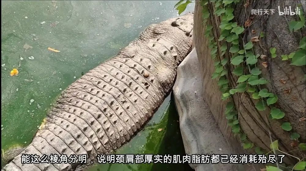 “小河刚进入壮年。”UP主在该短视频中称,正常雄性湾鳄应该是身体浑圆,躯干粗壮,身体横截面呈椭圆形,肩膀轮廓不明显。相比之下,小河的肩胛骨和脊柱突出,棱角分明,后背塌下,下腹凹进去,“鳄鱼成年个体即便几个月不吃东西,依旧能保证健康饱满的形态……可见它有多长时间没得到恰当的照顾。”