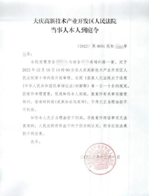 近日,大庆高新区法院在审理一起原告张某金与被告林某离婚纠纷一案中,根据案情审理需要,发出了首份《当事人本人到庭令》,以法院发出到庭令,成功督促当事人亲自出庭,参与法庭调查,最终在查清案件事实基础上达成了离婚调解协议,妥善处理了双方多年离婚问题及财产分割,并实现案结事了良好社会效果。据悉,这是全省首份《当事人本人到庭令》。