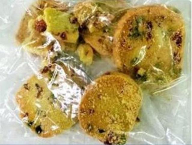 犯罪分子将毒品混在烘焙原料中制成曲奇饼干模样,从外表上看与某款饼干无异,里面夹杂着绿色的物质。打开包装袋有异味,含有大麻成分,这种大麻饼干价格高昂,一片售价50元,相比大麻原料,“饼干”成品的身价翻了10倍。“彩虹烟”