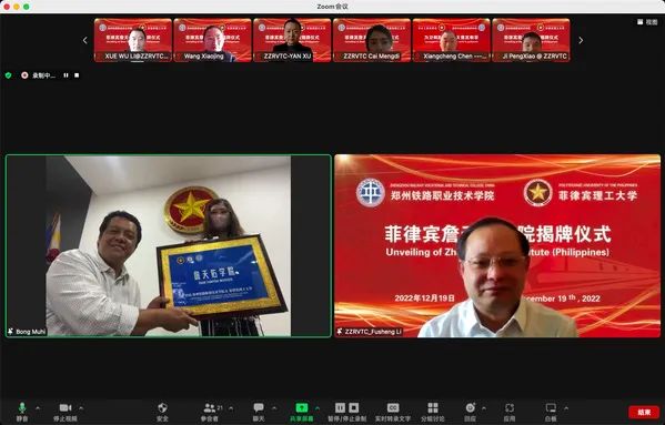 12月19日,郑州铁路职业技术学院与菲律宾理工大学联合举行詹天佑学院线上揭牌仪式。菲律宾理工大学校长曼纽尔•穆希、科技学院院长拉米尔·克鲁兹、国际事务办公室主任乔娜•卡拉•比恩,学校校长马玉霞、副校长李福胜,以及双方相关部门负责人共同出席了活动。