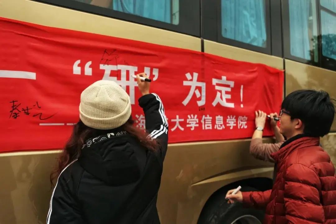 上海海洋大学的爱心专车。“星光不负赶路人,时光不负有心人!我们一‘研’为定!”“时不我待,天道酬勤,精耕细耘,开创辉煌!”两条贴在车上的横幅,也代表着送考师生的祝福。