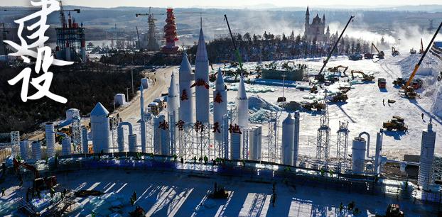 运冰车在场地里来回穿梭、挥舞着“长臂”的塔吊吊运着冰块、冰雕雪雕师傅们站在高高的冰建和雪雕上精心打磨着作品......