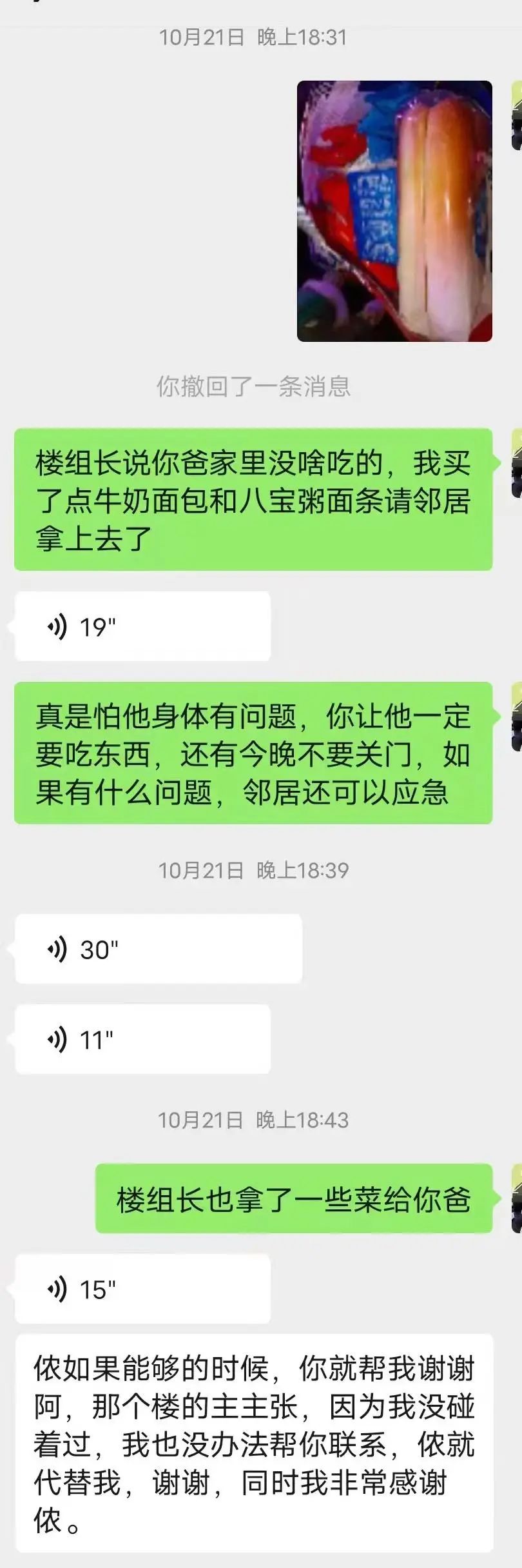 10月21日那次跌倒并且被送回家后,骆骆和党员楼组长李德红还为姚伯伯送去了餐食“姚伯伯,在家吗?”江建荣多次敲门无果,向骆骆反馈了这一情况后,转身下楼,前往老人常去的公园等场所寻找。姚老先生没有手机,身上也没有可供定位的智能穿戴设备,找起来并不容易。骆骆想到姚老先生听力不是很好,或许就在家里只是没听到敲门声。“找个邻居继续敲。”果然,在同楼层热心居民扈阿姨的持续努力下,姚老先生穿着单薄的睡衣开了门。“姚伯伯,联系不上你,大家急死咧,先穿好衣服,在电话面前坐好,我跟骆骆说,让你女儿打电话过来……”电话拨通,姚老先生的女儿放了心,一场近两个多小时的“寻找姚伯伯”任务,也圆满画上了句号。