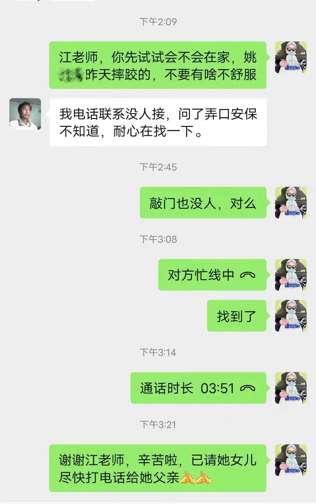 “骆骆,姚伯伯的情况我知道了,我去过他家里,马上上门查看。”原来,近期姚伯伯外出时,曾两次跌倒在弄堂里,是江建荣、党员楼组长李德红、热心居民钱良以及小区保安及时发现,一起把姚老先生送回了位于五楼的家中。江建荣送姚老先生回家之后,还为其处理了皮外伤之后才放心离开。
