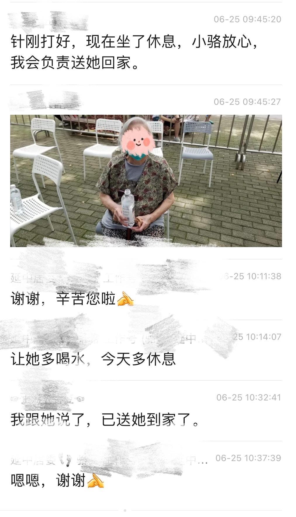 采访过程中,骆骆除了对江建荣等为姚老先生提供帮助的热心志愿者很感激,还提到有不少热心居民也在默默关爱着社区和邻里。长乐路434弄24号楼组长钱良,退休之后热心社区工作,不仅悉心照料同楼栋的独居老人,还积极参与残疾人工作,是延中社区残疾人协会的骨干。今年夏天,虽然街道多次开展送新冠疫苗进社区活动,依然有部分腿脚不便的老人无法自行前往接种点。那段时间,是钱良顶着高温,和居委干部们一起为社区老人提供接种服务:每天前往指定地点为预约接种的老人准备好接种二维码,然后陪同老人往返社区接种点,帮助众多老人在感染高峰到来之前建立起自身免疫屏障。
