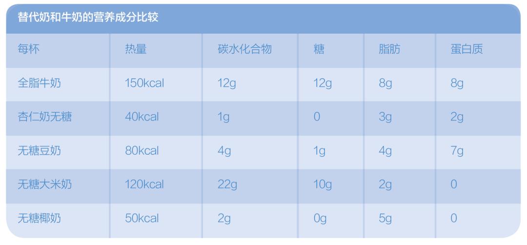 有很多人会选用这些奶来替代早餐中的牛奶,或者用这些奶来做咖啡,如豆奶拿铁、杏仁奶摩卡之类。这些奶实际上是植物来源的,营养成分和真正的牛奶相比还是有差距的。