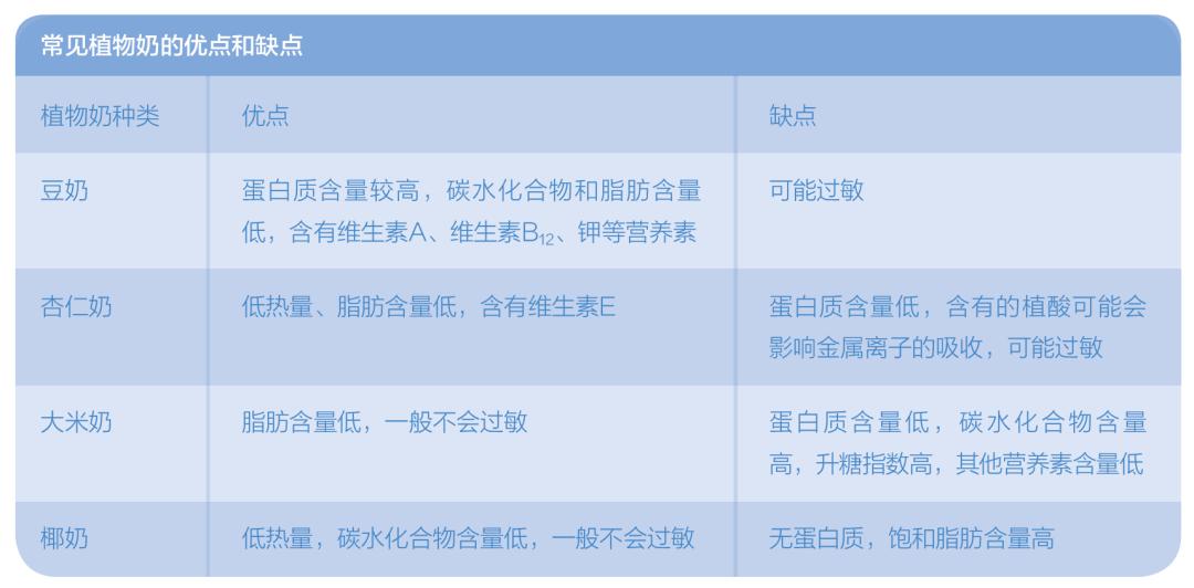 如果需要控制热量或者是素食者,可以选择植物奶来替代牛奶,但是要注意从其他食物中增加一定蛋白质的摄入,同时注意选购添加了维生素D 和钙的产品。健康提示