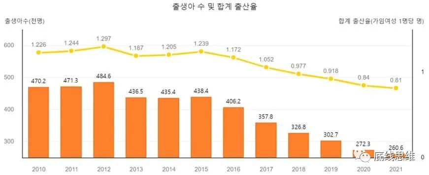 根据韩国统计厅的报告,2021年,韩国总体生育率降至史无前例的0.81,刷新了由韩国自己保持的世界最低生育率记录。而即将出炉的2022年统计结果恐怕会是一系列更加糟糕的数据。