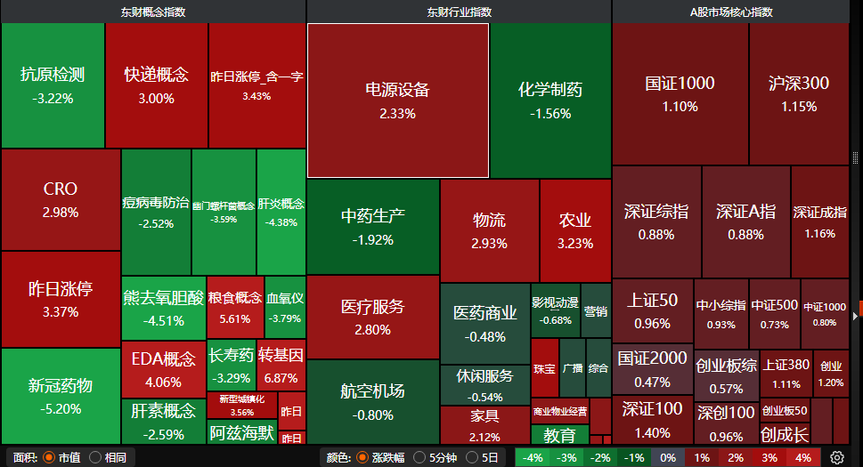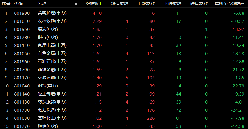 板块呈现轮动效应,美容护理板块走强,涨幅超过4%,奥园美谷涨停,爱美客涨幅超过6%,贝泰妮涨幅超过9%。农林牧渔板块涨幅超过2%,煤炭、银行、家用电器、有色金属、石油石化、非银金融等板块涨幅接近2%。