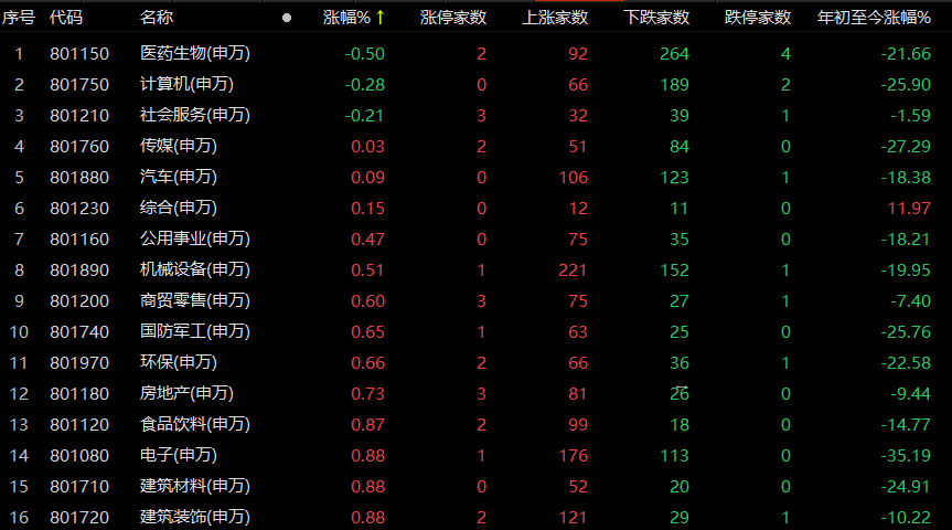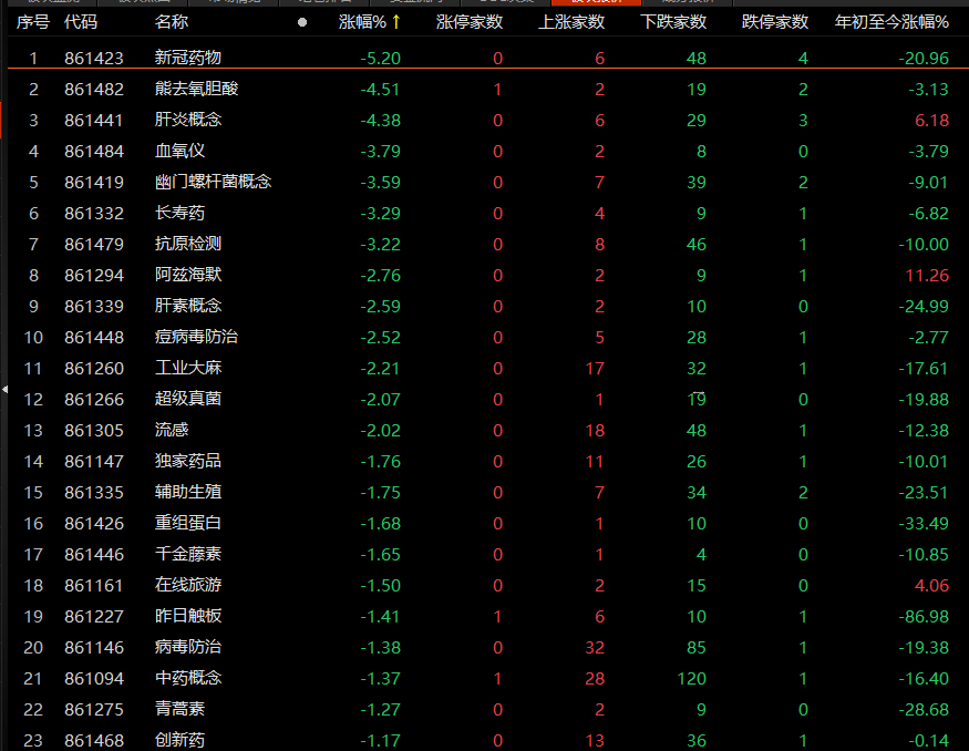 医药股走低,其中新冠药物、熊去氧胆酸、血氧仪、抗原检测等相关概念股领跌,以岭药业跌近8%,众生药业、新华制药跌停,九安医疗、东方生物等个股跌幅近6%。