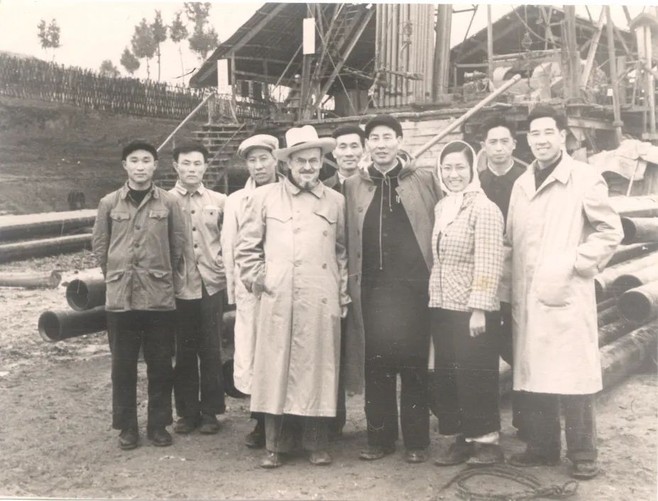 1958年3月,华泽澎、卢爱珠老师陪同苏联专家、工业经济教授杜那耶夫考察四川油气田时合影(右一为华泽澎)