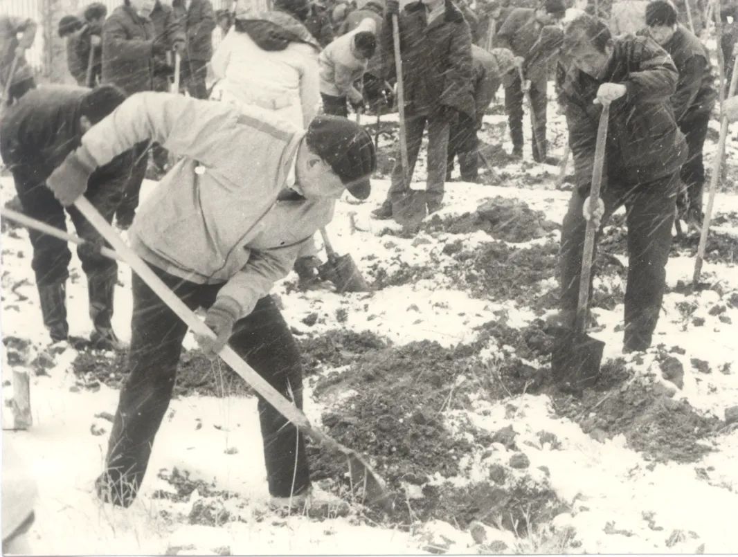 1991年3月3日,为美化校园,华泽澎和师生员工一起冒雪植树