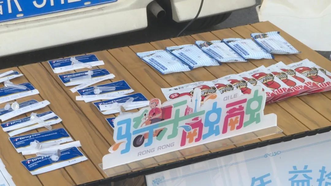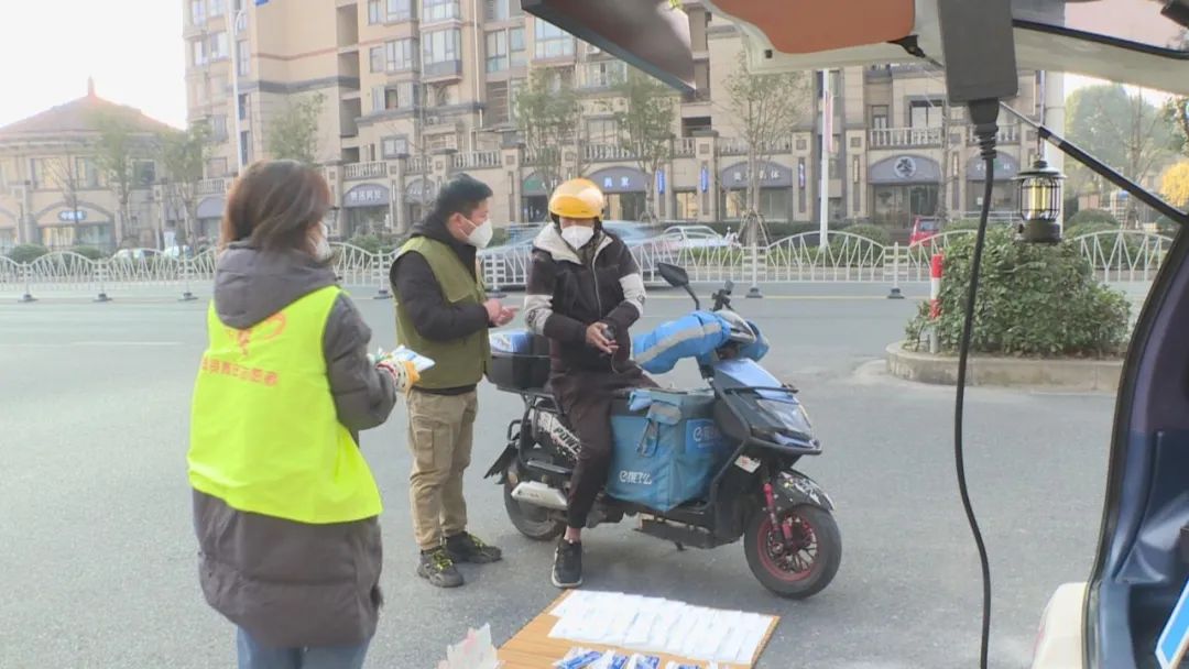 “你们每天要接触很多人,还是要戴上这个N95口罩,如果每天都需要的话,你们可以晚上过来这边领,我们晚上6点到8点钟都在这里。”这两个拦着小哥送物资的人就是郑瑜和志愿者张雨诗。十年来,郑瑜负责的“拾光”新时代文明实践志愿服务队一直参与社会公益活动。观察到外卖骑手近期工作量增多,且多数人用的还是普通口罩,他们便发起了这次“你送餐,我送暖”活动。志愿者们发动身边和社会爱心企业等各方力量,特意准备了N95口罩、抗原、湿纸巾、暖宝宝以及暖姜水等爱心物资,免费送给路过的骑手们,计划一直延续到1月20日小年夜。