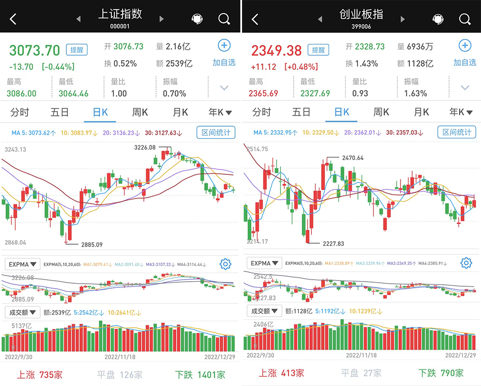 至12月29日收盘,上证综指跌0.44%,报3073.7点;科创50指数涨0.52%,报962.25点;深证成指跌0.13%,报10996.41点;创业板指涨0.48%,报2349.38点。Wind统计显示,两市1572只股票上涨,3308只股票下跌,平盘有153只股票。
