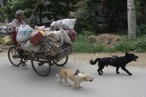 狗狗奋力帮奶奶“拖”废品车2022年9月2日,河南南阳,一老奶奶骑三轮车捡废品贴补家用,两只狗狗在前面奋力拉车。