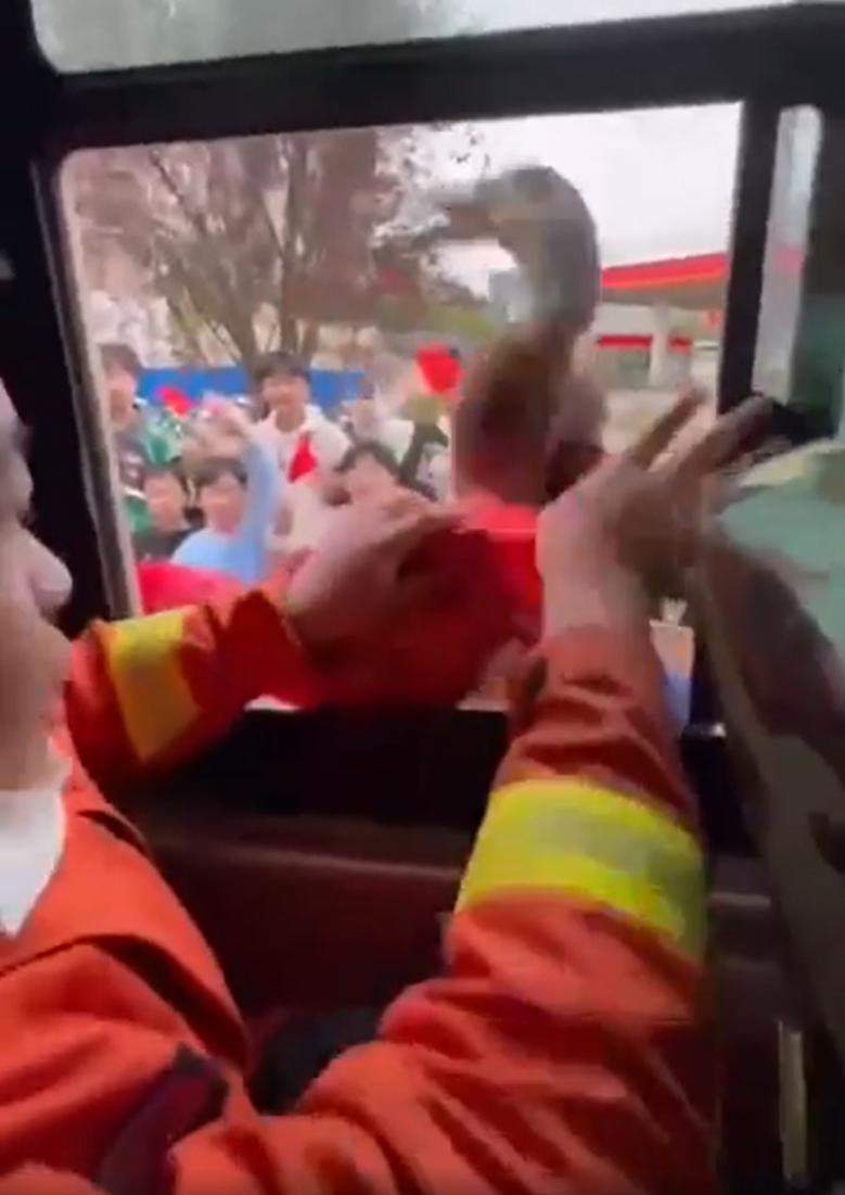 2022年10月28日,湖南新田县,增援新田山火的消防员返程时向群众挥手告别时,猝不及防被塞“感谢鸭”。