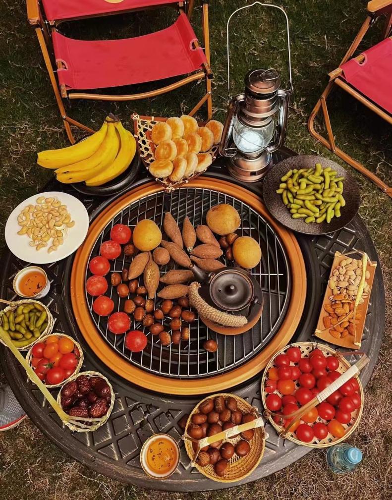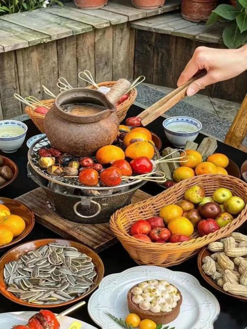 花生被烤得焦香、板栗霹雳作响、茶壶咕噜咕噜冒着白气、红薯柿子轮番烤起来、年糕被炙烤得鼓鼓囊囊、棉花糖散发着焦糖香、烘过的橘子皮飘着清香,色、香、味全已融于这一小小的炉火之中了。
