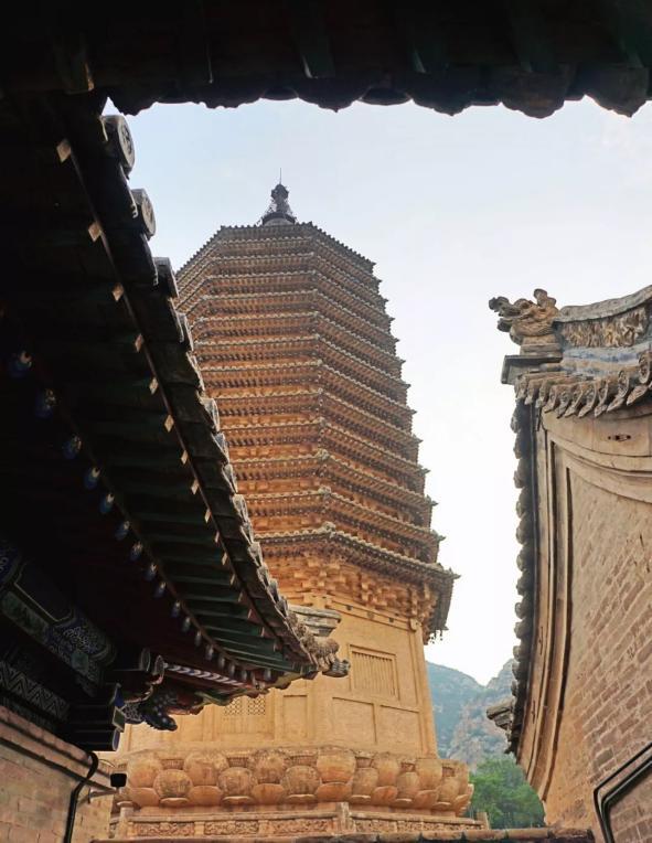 更令人称奇的是,密檐式砖塔、凤凰台上之小塔和古井的高度、深度均为十三丈,饶有趣味。不知是有意为之,还是巧合,故有“塔井山齐”之说。当风从山谷间穿过,吹响檐角的铜铎,那苍凉婉转的铃声好似佛国梵乐。