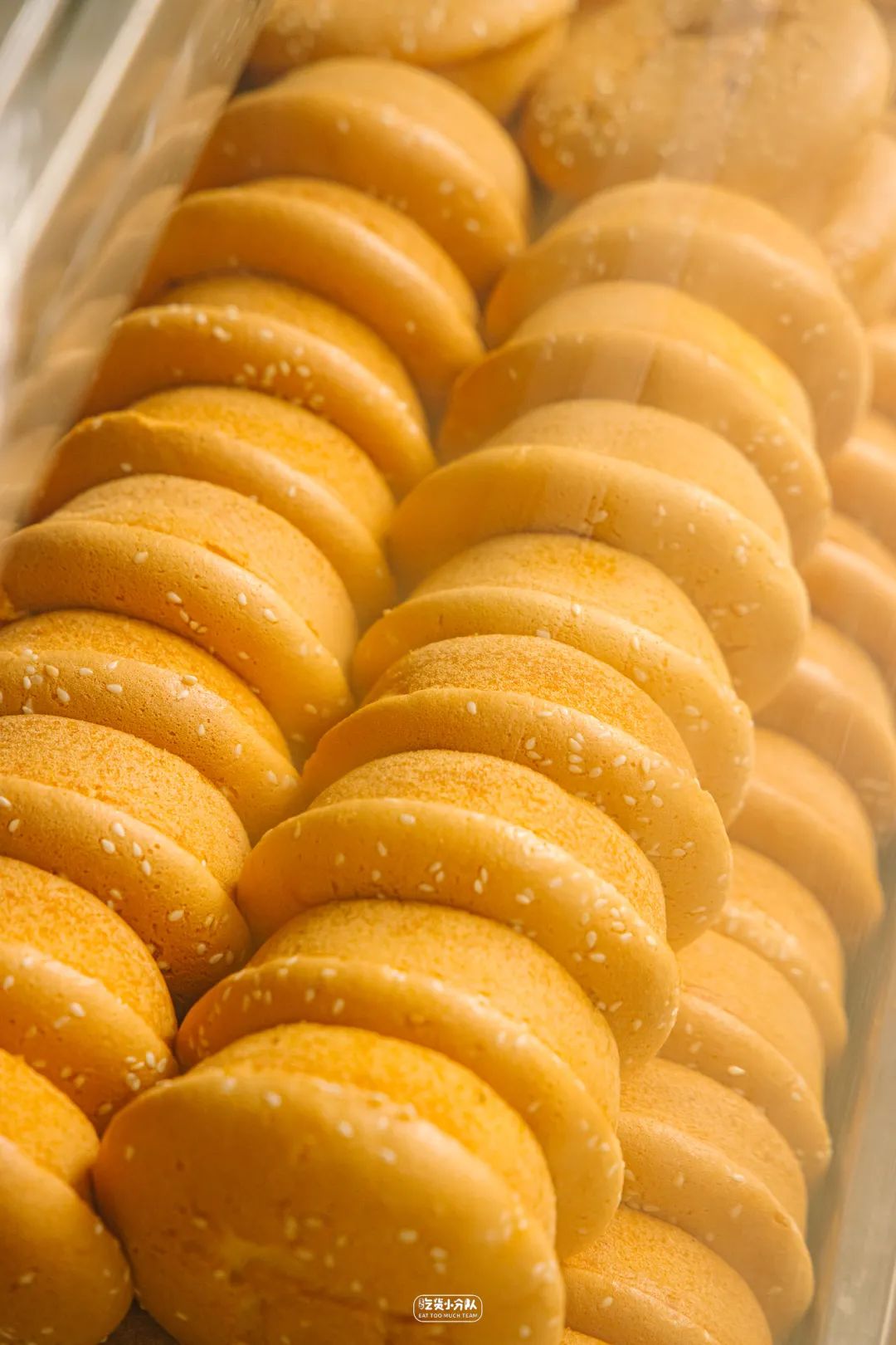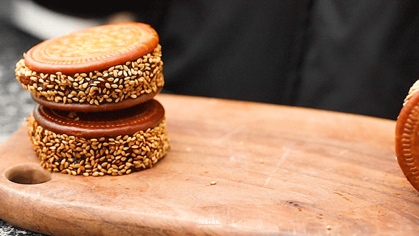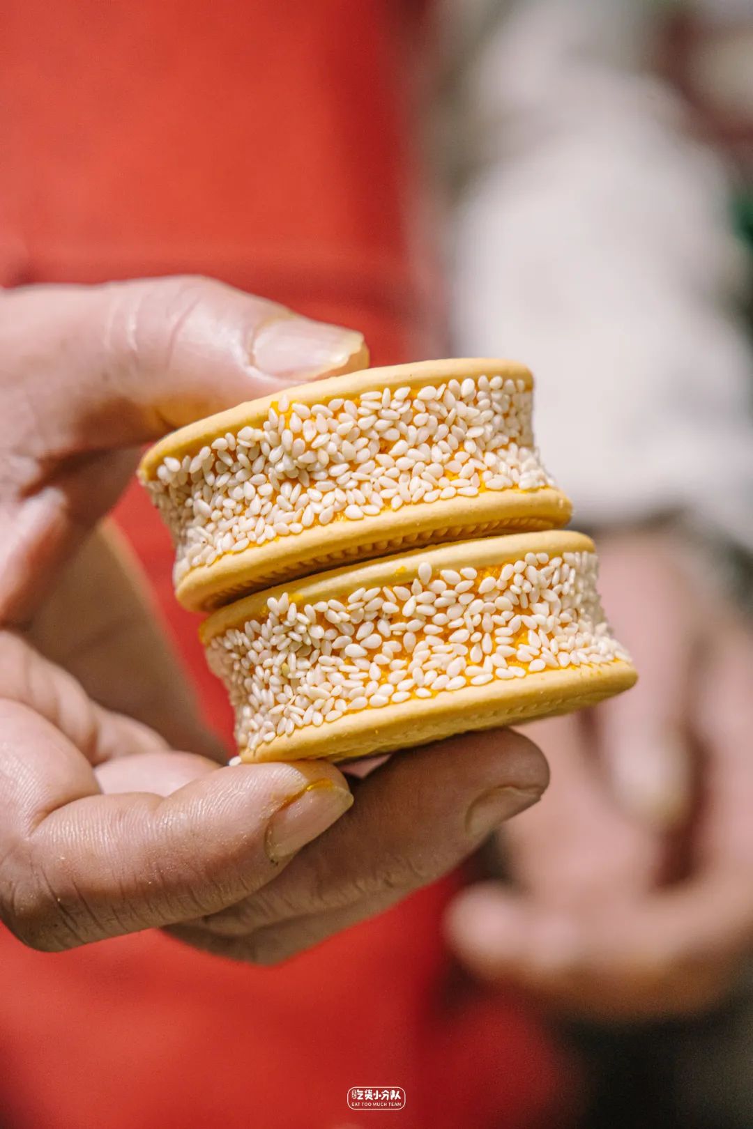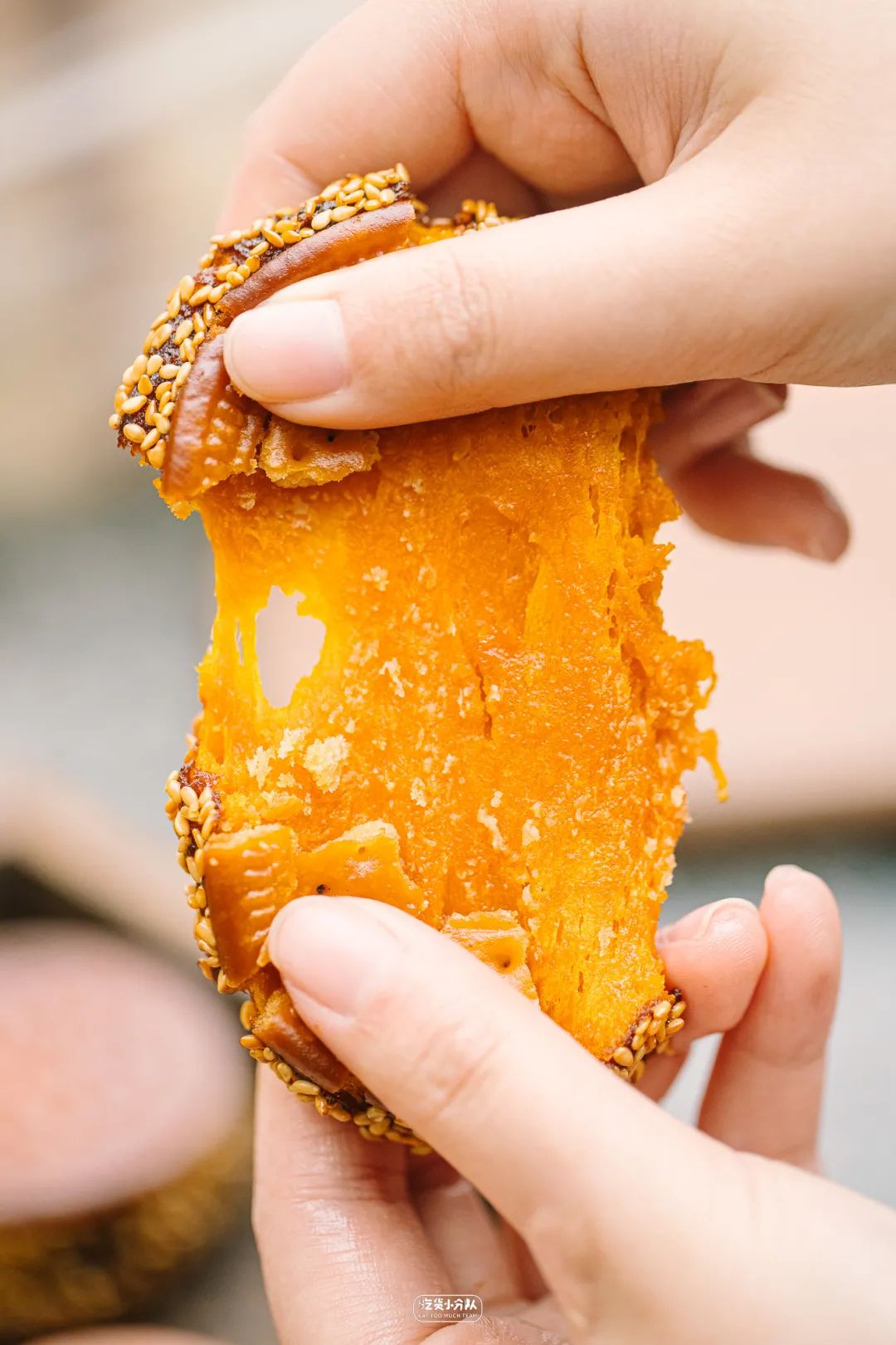 南瓜混合糯米的内芯,无比软糯。南瓜味道浓郁,整体黏黏的有嚼劲,配合酥饼干和相当有存在感的白芝麻,甜而不腻,外脆里糯,在口腔里会引起一阵火山喷发般的香味浪潮。