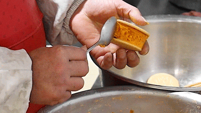 两片早餐饼干里,夹入自制厚厚的南瓜糯米泥,再用勺子刮走溢出来的部分,修成漂亮的形状。「滚」