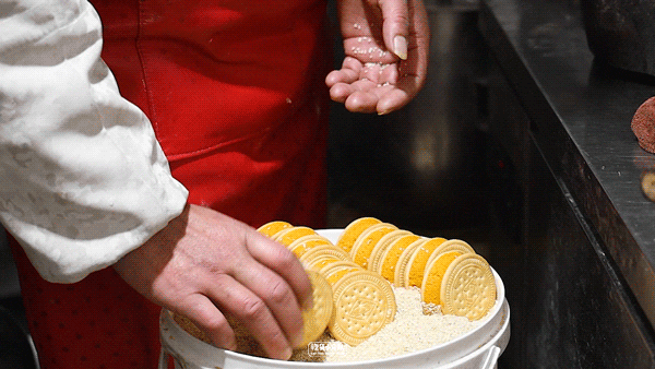 一整桶白芝麻,饼干在里面滚一圈,南瓜泥就自然黏在了上头,满满当当的。手一压一搓,就定型了。「炸」